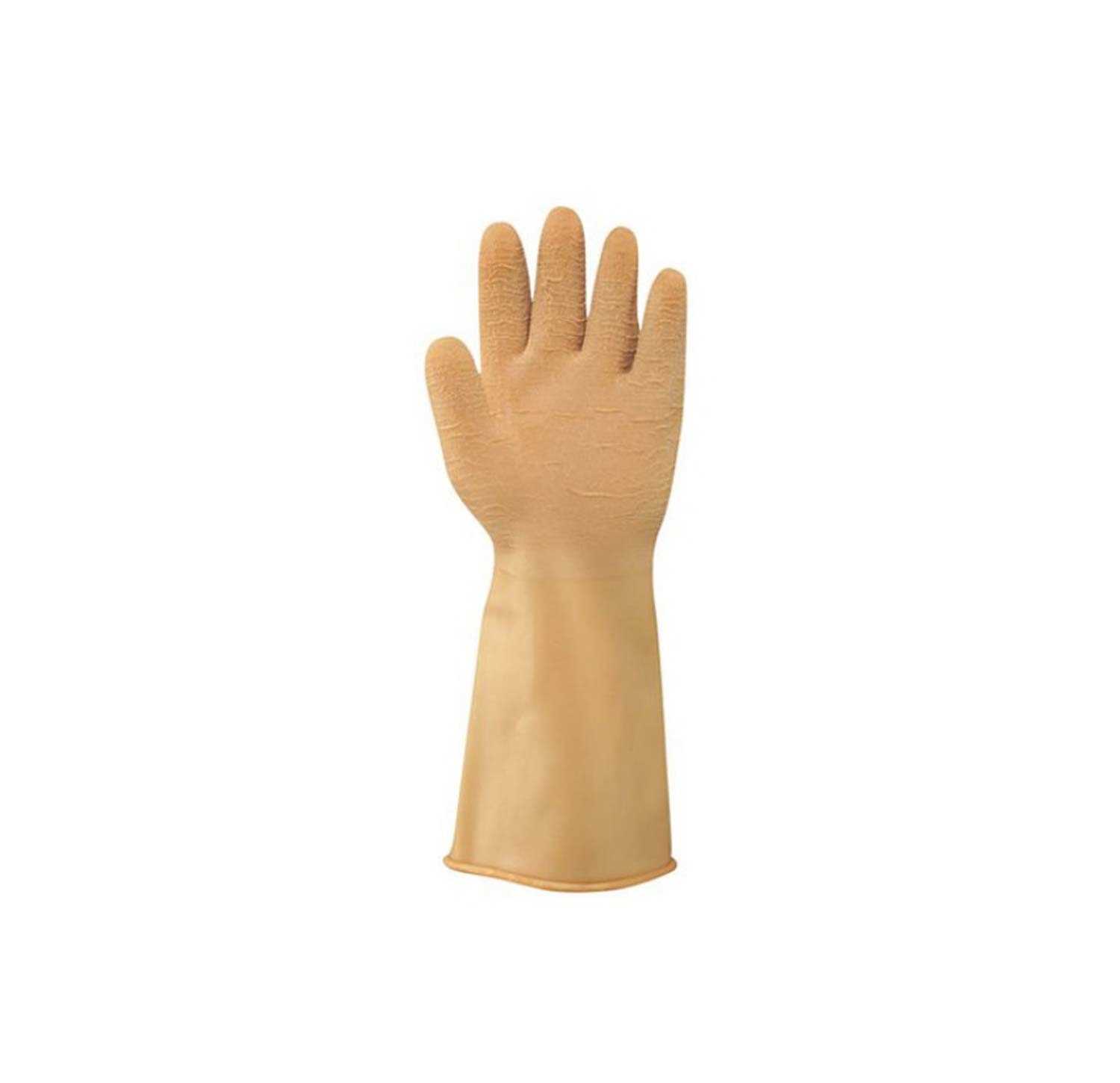 DESCRIZIONE: Guanto in lattice palmo e dorso zigrinati. Interno liscio. Bordino salvagoccia. Lunghezza 35 cm