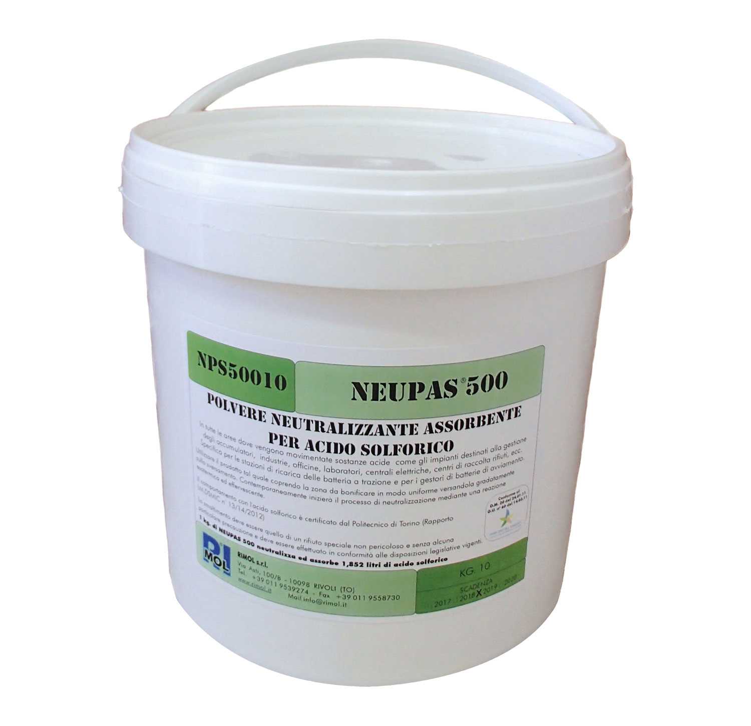 Assorbente neutralizzatore privo di argilla e silicone, ignifugo, biodegradabile, antisdrucciolevole e non suscettibile di formare fanghi a contatto con acqua o olii. Il prodotto è stato testato e certificato dal Politecnico di Torino, rispondendo pienamente ai requisiti del D.M. n.20 del 24 gennaio 2011 del Ministero dell’Ambiente (attuativo dell’art. 195 comma 2 del D.Lgs n.152 del 3 aprile 2006).
