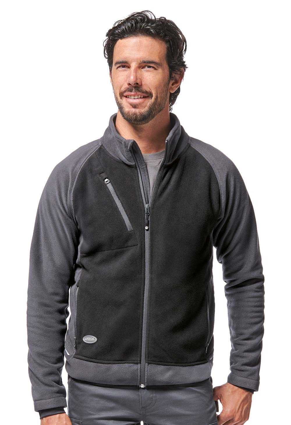 DESCRIZIONE: Pile zip lunga con due tasche laterali e una tasca alta sulla parte destra, con chiusura a zip e portanome a scomparsa. Polsini antivento elasticizzati.