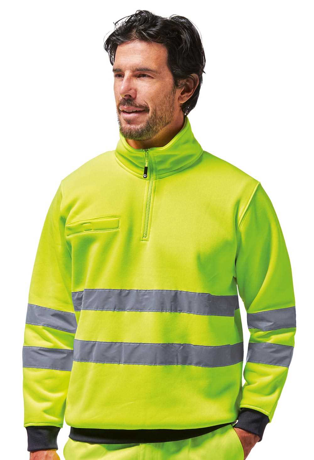 DESCRIZIONE: Felpa alta visibilità con zip corta. Polsini e fondo vita elasticizzati blu. Doppia banda rifrangente H 5 cm. Taschino nel petto a destra chiuso con velcro. Portanome a scomparsa.