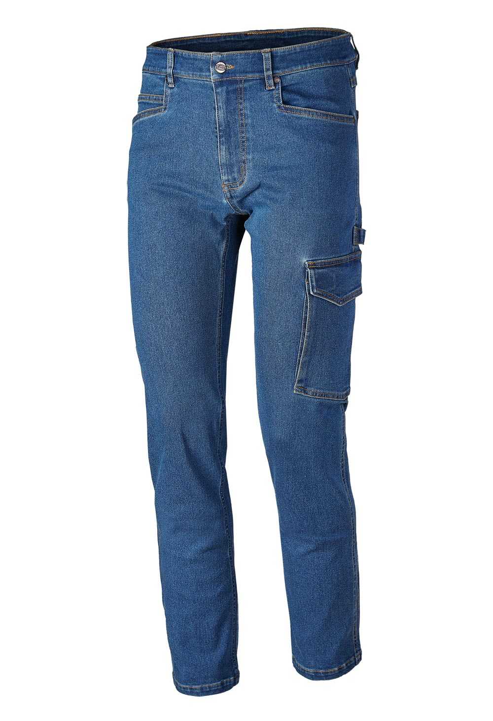 DESCRIZIONE:Pantalone jeans con due tasche a filetto e due tasche dietro, tascone laterale e portamartello a sinistra, portametro a destra. Chiusura con bottone e zip. Doppie cuciture nei punti di maggior sforzo.