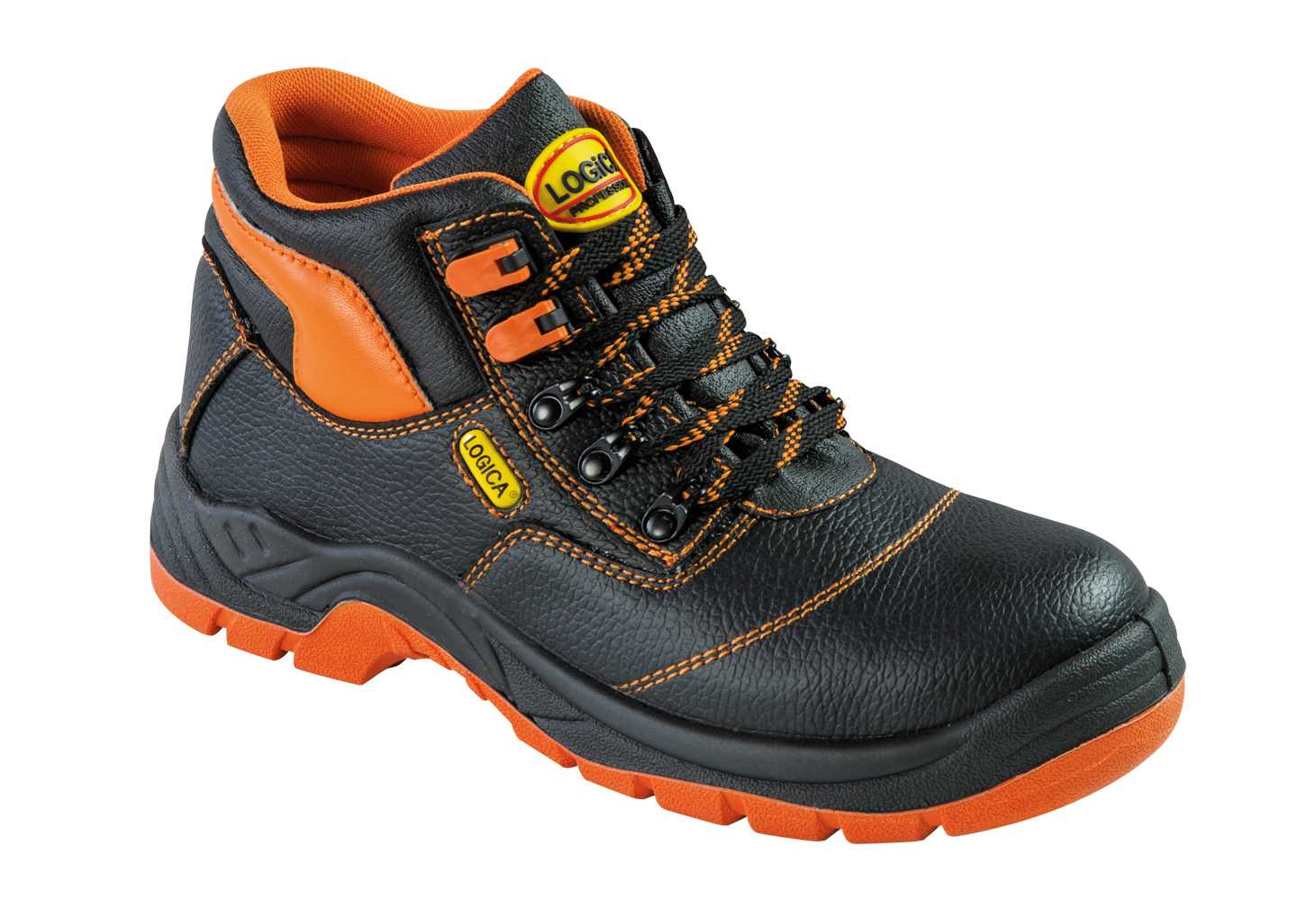 TOMAIA: Modello alto in pelle verniciata nera idrorepellente. Doppie cuciture arancio, linguetta imbottita ed occhielli in metallo