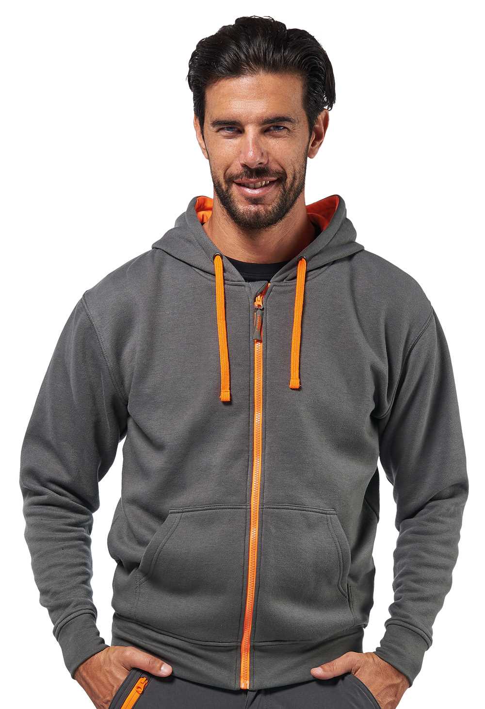 DESCRIZIONE: Felpa zip lunga con cappuccio. Due tasche laterali a marsupio. Polsini e fondo vita in maglia elastica. Colore cappuccio in contrasto.