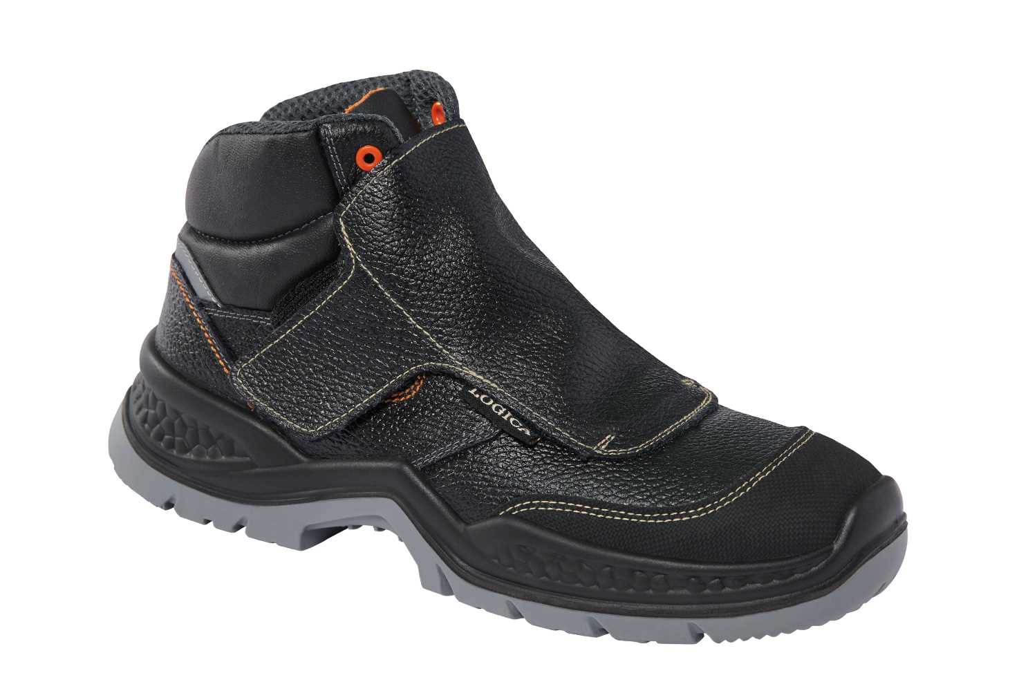 TOMAIA: Modello alto in pelle verniciata nera, con cuciture in kevlar anticalore nella parte frontale. copertura metatarsale morbida apribile con velcro. Rinforzo sulla punta in pelle gommata antiabrasione. Inserti in materiale riflettente sul posteriore. Totalmente METALFREE senza parti metalliche