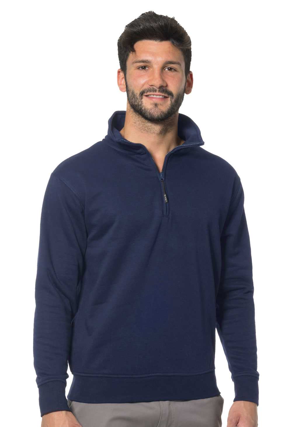 DESCRIZIONE: Felpa monocolore con zip corta. Collo a lupetto. Polsini e fondo vita elasticizzati. Nastro di rinforzo al collo.