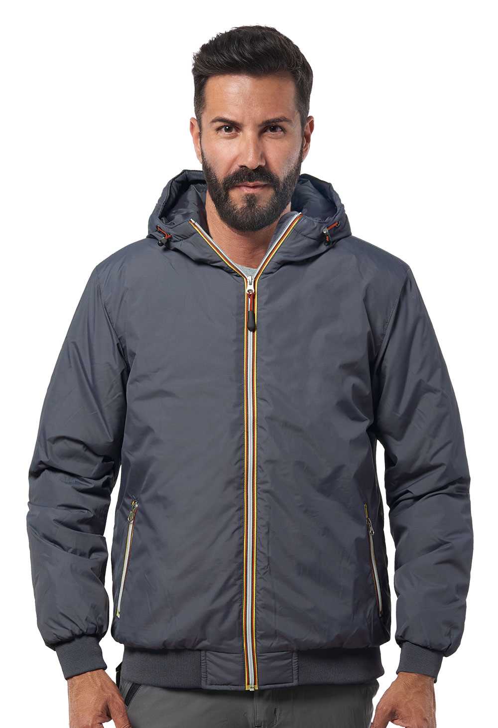 DESCRIZIONE: Giubbino in nylon con cerniera in contrasto (gialla/rossa/nera), due tasche esterne con zip, due tasche interne con velcro, polsini e fondo in maglia elasticizzata, cappuccio imbottito con chiusura regolabile con coulisse