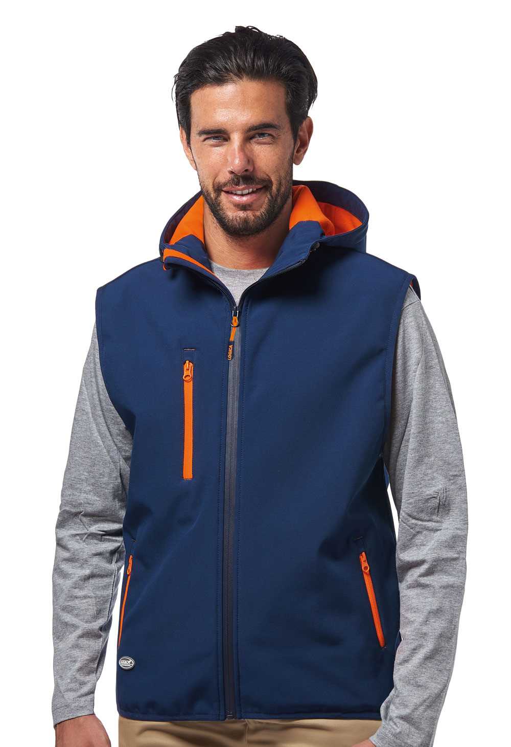 DESCRIZIONE: Gilet softshell con due tasche in vita con cerniera ed una tasca sul petto. Interno in pyle. Con cappuccio fisso. Zip antivento.