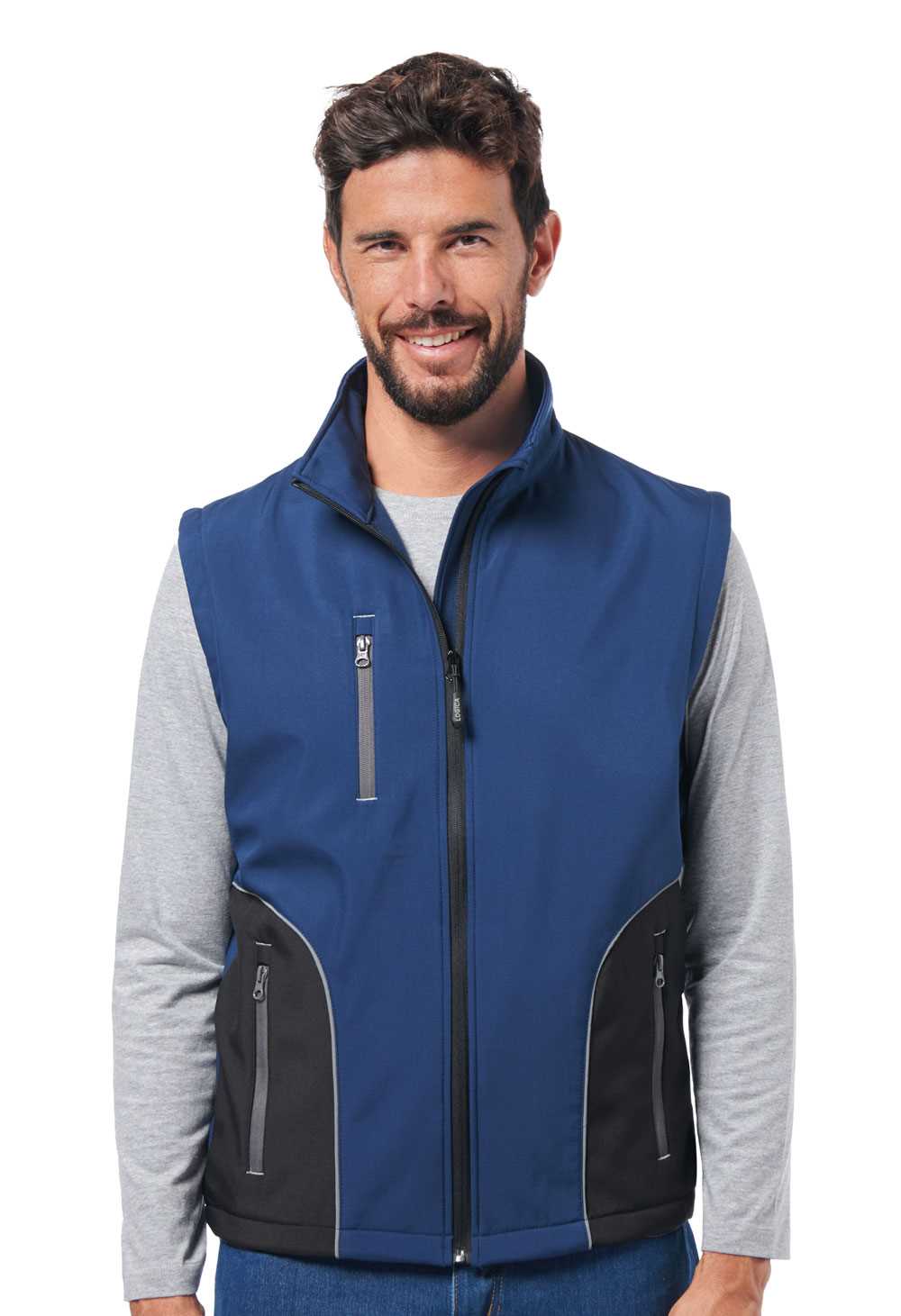 DESCRIZIONE: Gilet soft-shell bicolore. Due tasche in vita ed una sul petto con cerniere antivento. Interno in pyle. Profili rifrangenti. Coulisse al fondo.