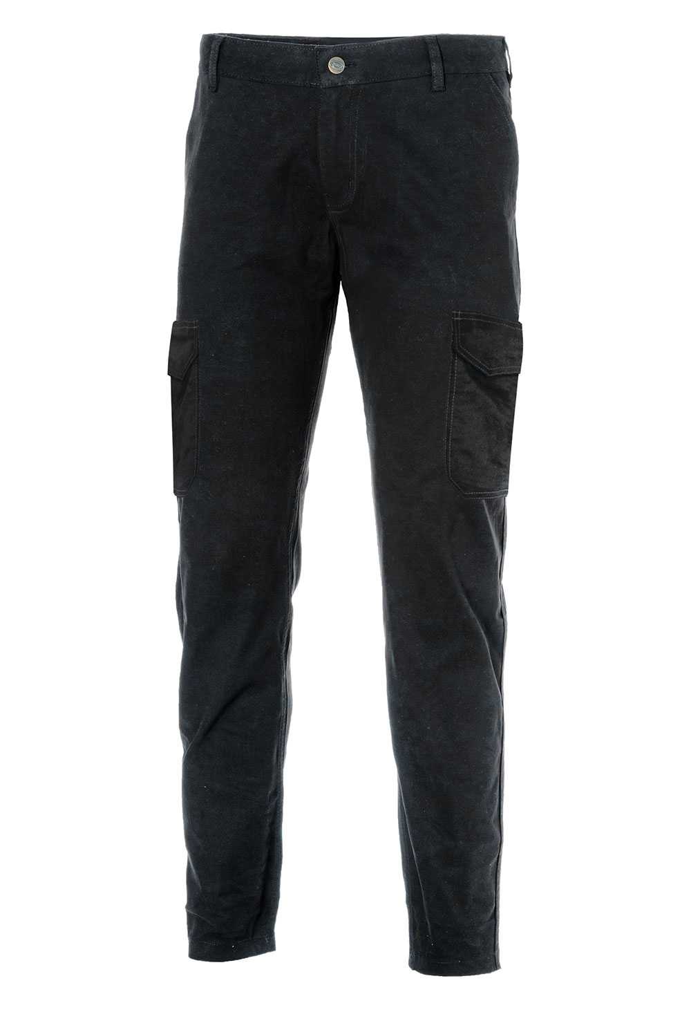 DESCRIZIONE: Pantalone con due tasche laterali a filetto, una dietro e due tasconi sul gambale chiuse con patta. Apertura frontale con zip e bottone di chiusura. Doppie cuciture nei punti di maggior sforzo.