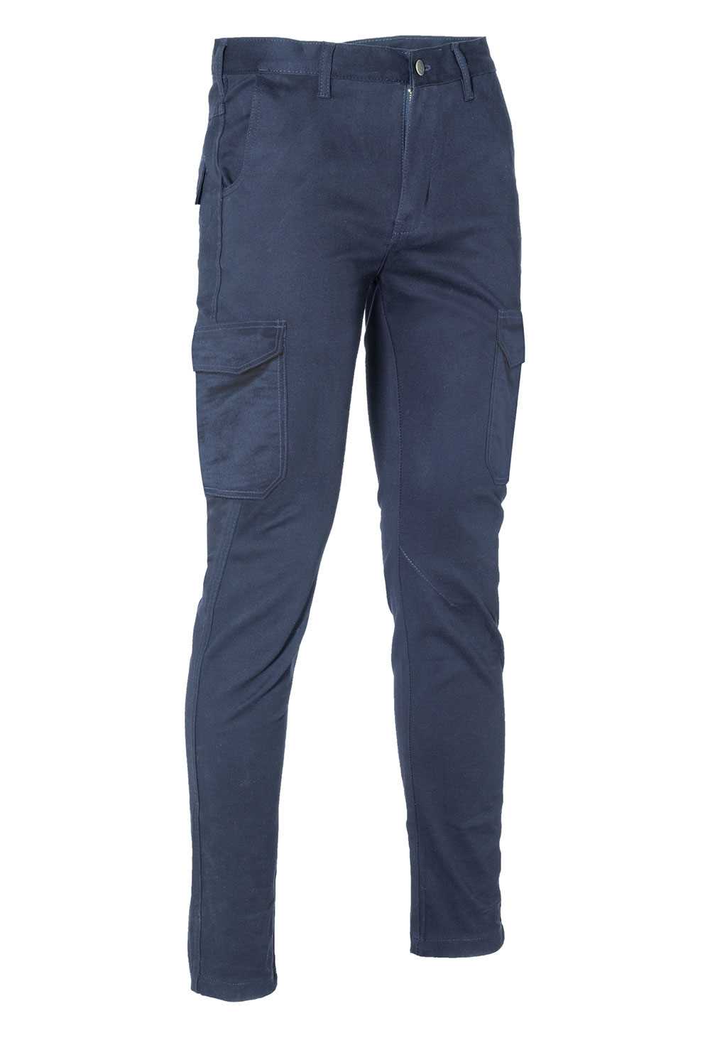 DESCRIZIONE: Pantalone con due tasche laterali a filetto, una dietro e due tasconi sul gambale chiuse con patta. Apertura frontale con zip e bottone di chiusura. Doppie cuciture nei punti di maggior sforzo.