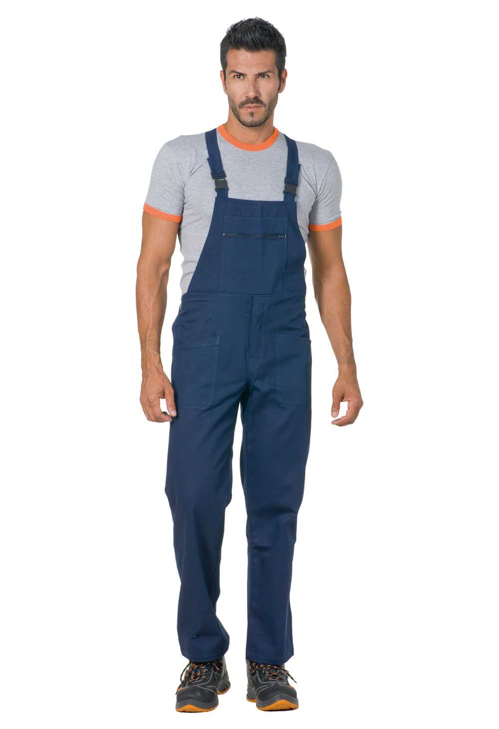DESCRIZIONE: Salopette con bretelle regolabili con fibbia. Due tasche anteriori a filetto e una dietro. Portametro sulla destra. Tascone sulla pettorina con cerniera. Chiusura frontale con bottoni ricoperti da patta. Elastico sul posteriore. Doppie cuciture nei punti di maggior sforzo.
