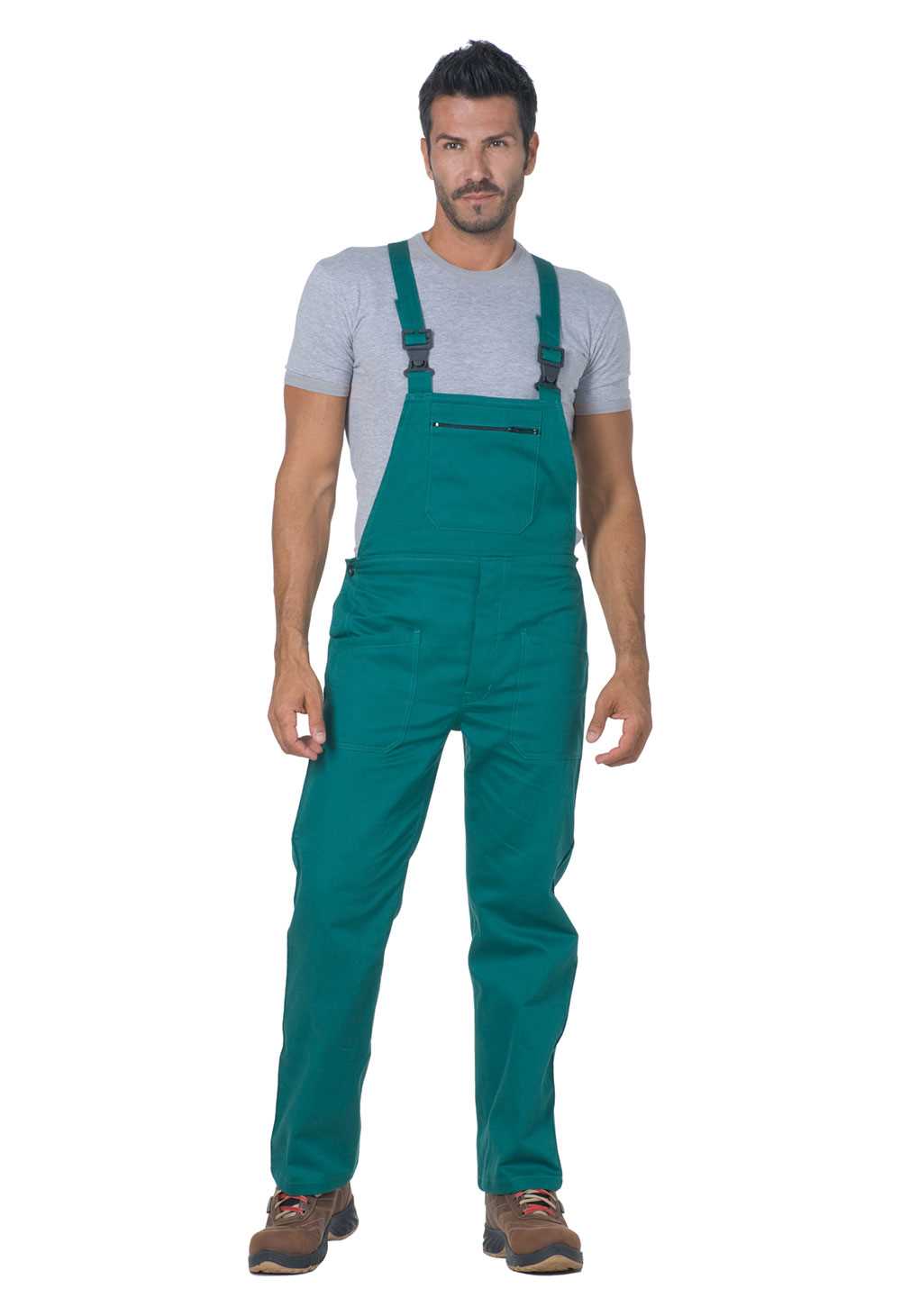 DESCRIZIONE: Salopette con bretelle regolabili con fibbia. Due tasche anteriori a filetto e una dietro. Portametro sulla destra. Tascone sulla pettorina con cerniera. Chiusura frontale con bottoni ricoperti da patta. Elastico sul posteriore. Doppie cuciture nei punti di maggior sforzo.
