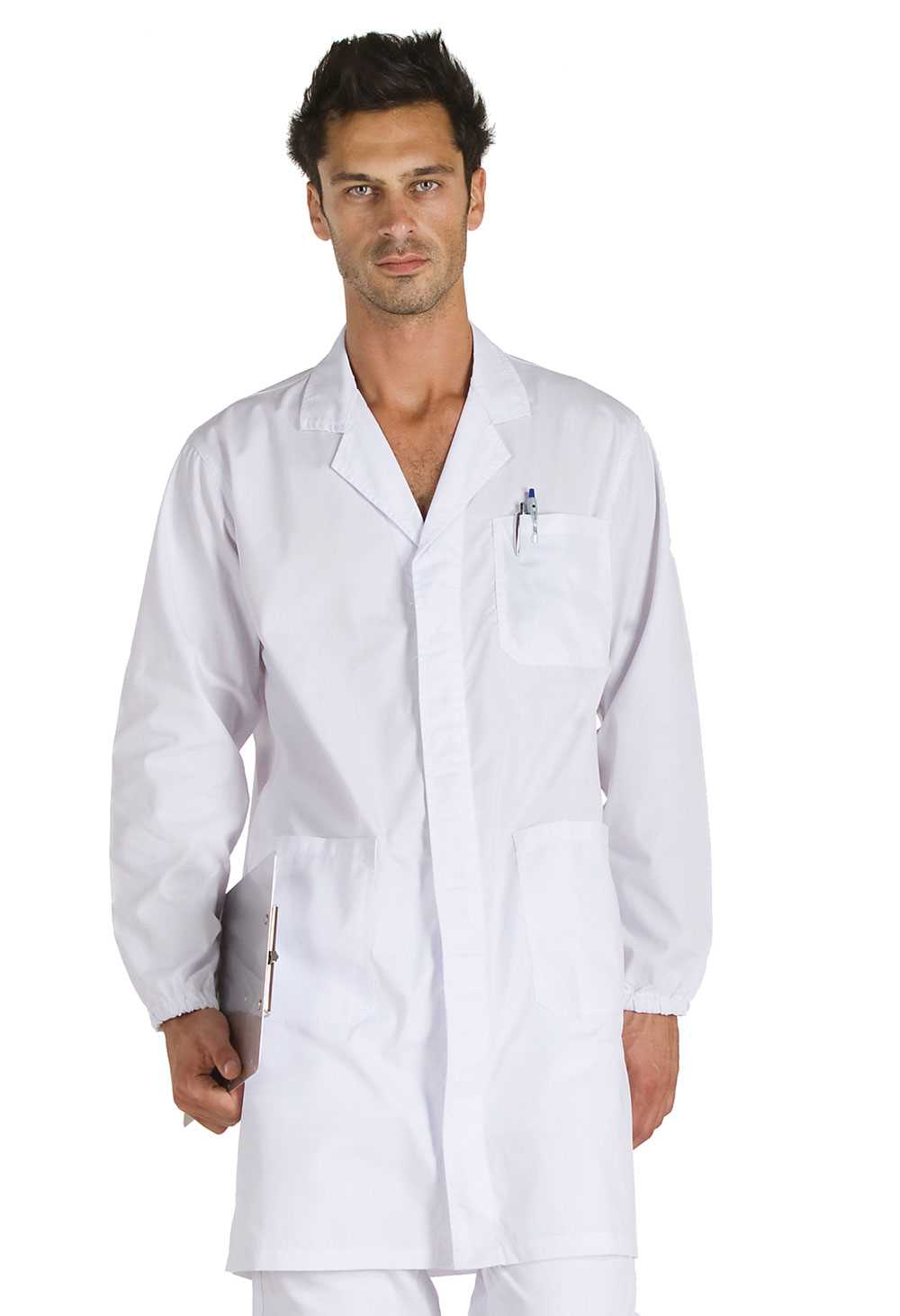 DESCRIZIONE: Camice unisex da laboratorio, con due tasche basse e un taschino sul petto. Chiusura con bottoni ricoperti da patta. Polsino elastico. Colletto a camicia.