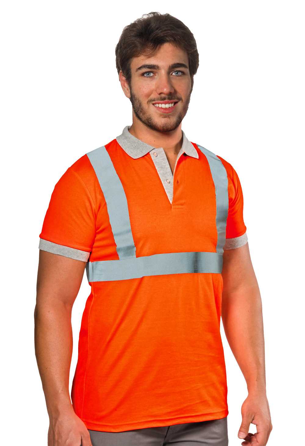 DESCRIZIONE: Polo alta visibilità’ manica corta con bande rifrangenti di 5 cm. Tre bottoni al collo. Colletto e giromanica in maglia grigia.