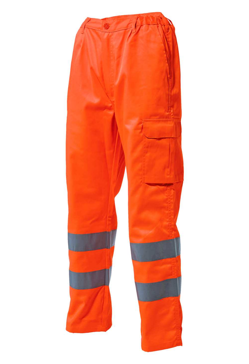 DESCRIZIONE: Pantalone alta visibilità con due tasche laterali a filetto, una dietro chiusa con bottone, un tascone laterale e portametro. Apertura frontale a zip. Elastico in vita sul posteriore. Doppia banda rifrangente H 6 cm. Doppie cuciture nei punti di maggior sforzo.