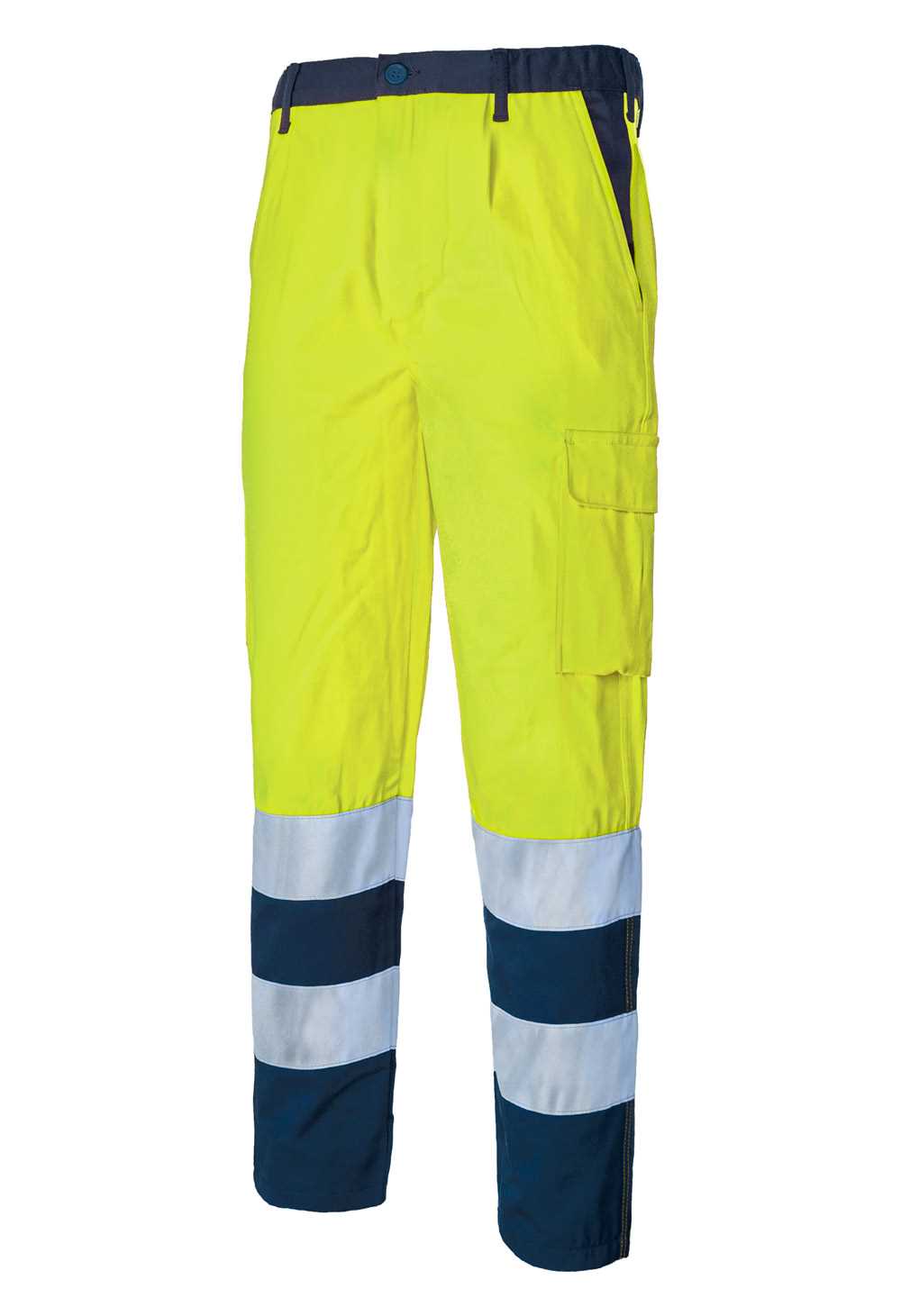 DESCRIZIONE: Pantalone alta visibilità con due tasche laterali a filetto, una dietro chiusa con bottone un tascone laterale e portametro. Apertura frontale con zip. Elastico in vita sul posteriore. Doppia banda rifrangente H 7 cm. Doppie cuciture nei punti di maggior sforzo.