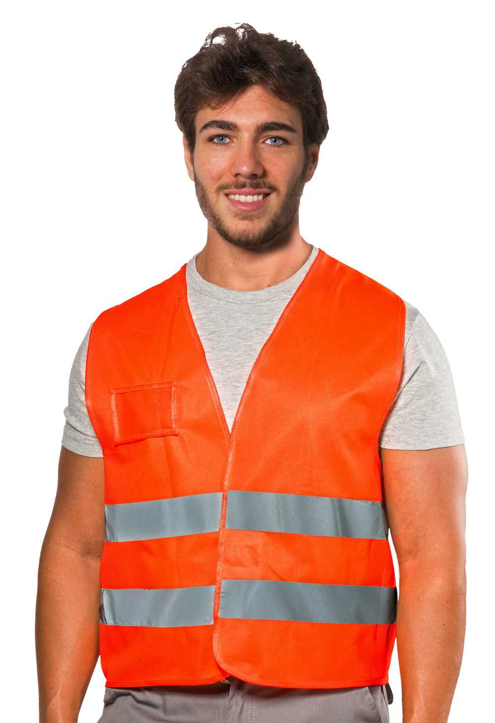 DESCRIZIONE: Gilet alta visibilità con chiusura centrale con velcro regolabile. Doppia banda rifrangente H 5 cm. Con portanome sulla sinistra per l’inserimento del tesserino di riconoscimento. Confezionato in astuccio.