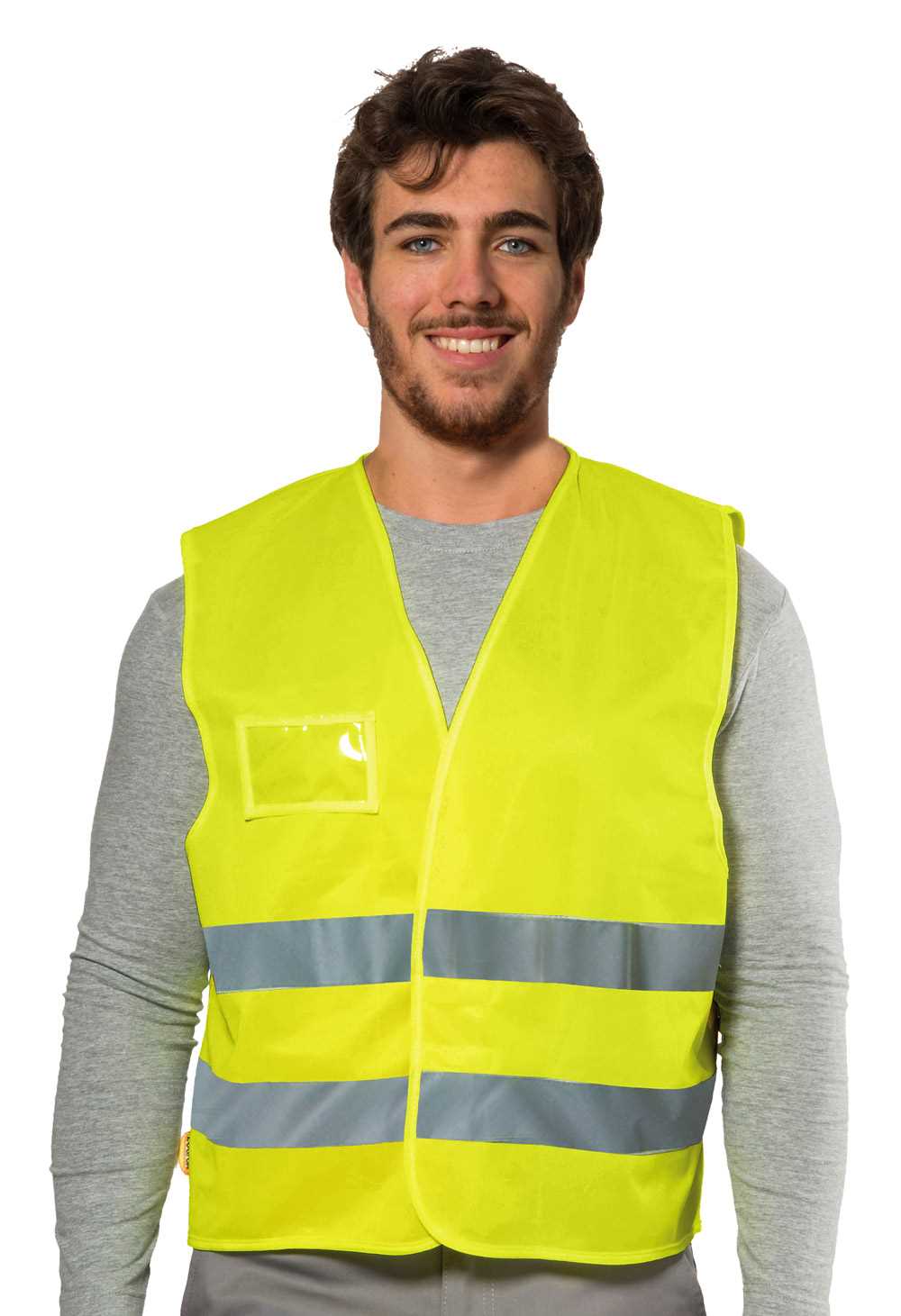 DESCRIZIONE: Gilet alta visibilità con chiusura centrale con velcro regolabile. Doppia banda rifrangente H 5 cm. Con portanome sulla sinistra per l’inserimento del tesserino di riconoscimento. Confezionato in astuccio.