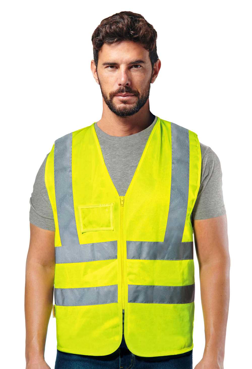 DESCRIZIONE: Gilet alta visibilità due bande rifrangenti orizzontali di 5 cm e bande rifrangenti verticali sulle spalle. Con porta cartellino su lato destro. Chiusura centrale con zip.