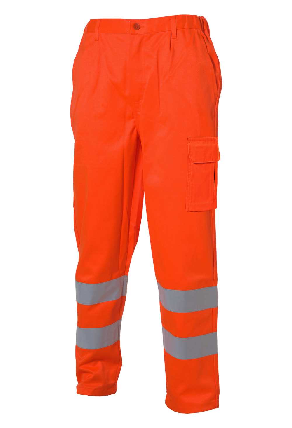 DESCRIZIONE: Pantalone alta visibilità con due tasche laterali a filetto, una dietro chiusa con bottone un tascone laterale e portametro. Apertura frontale con zip. Elastico in vita sul posteriore. Doppia banda rifrangente H 7 cm. Doppie cuciture nei punti di maggior sforzo.