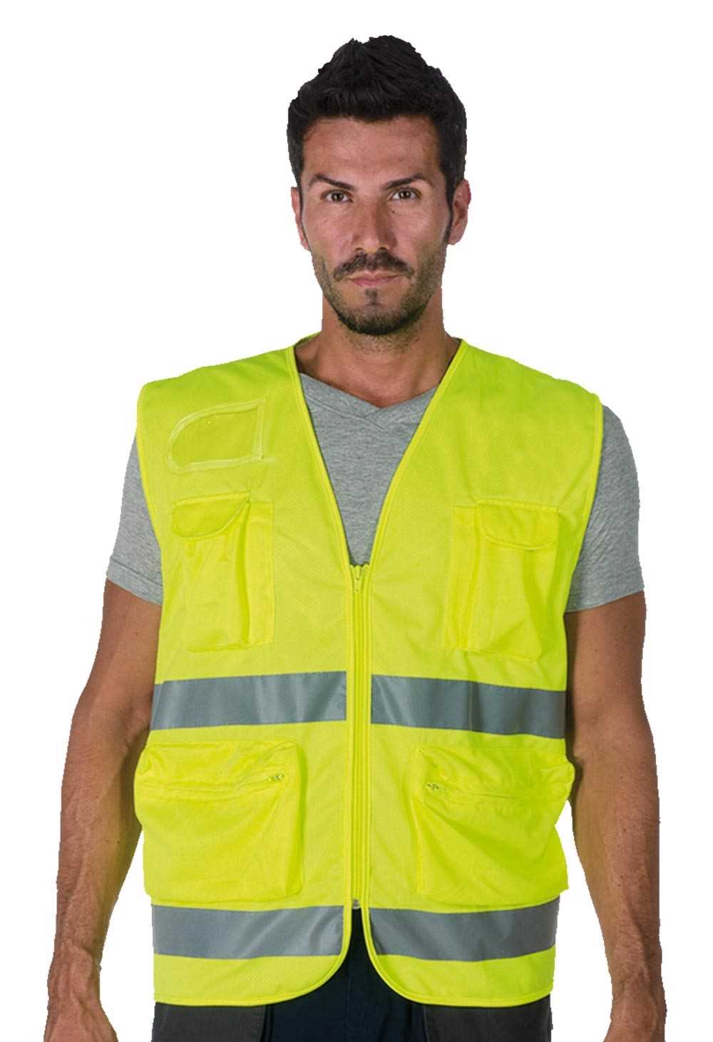 DESCRIZIONE: Gilet altavisibilità’ con quattro tasche, due bande rifrangenti orizzontali di 5 cm. Chiusura con cerniera. Portanome sulla parte sinistra.