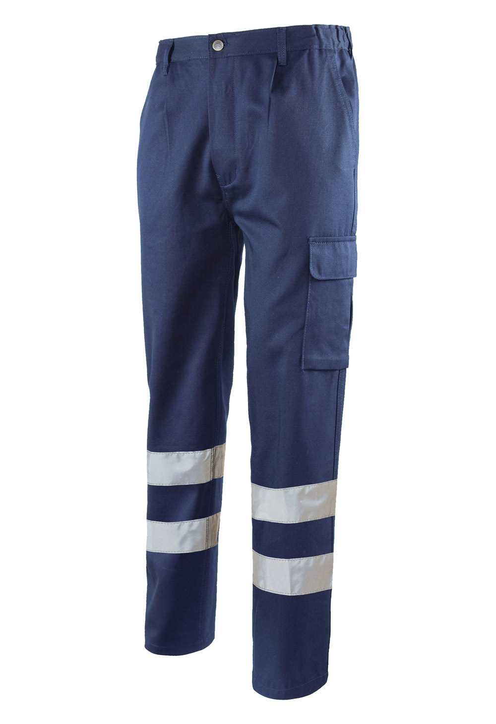 DESCRIZIONE: Pantalone con due tasche laterali a filetto e una dietro. Portametro sulla destra. Tascone sulla sinistra. Doppia banda rifrangente. Chiusura frontale con bottoni ricoperti da patta. Elastico in vita. Doppie cuciture nei punti di maggior sforzo.