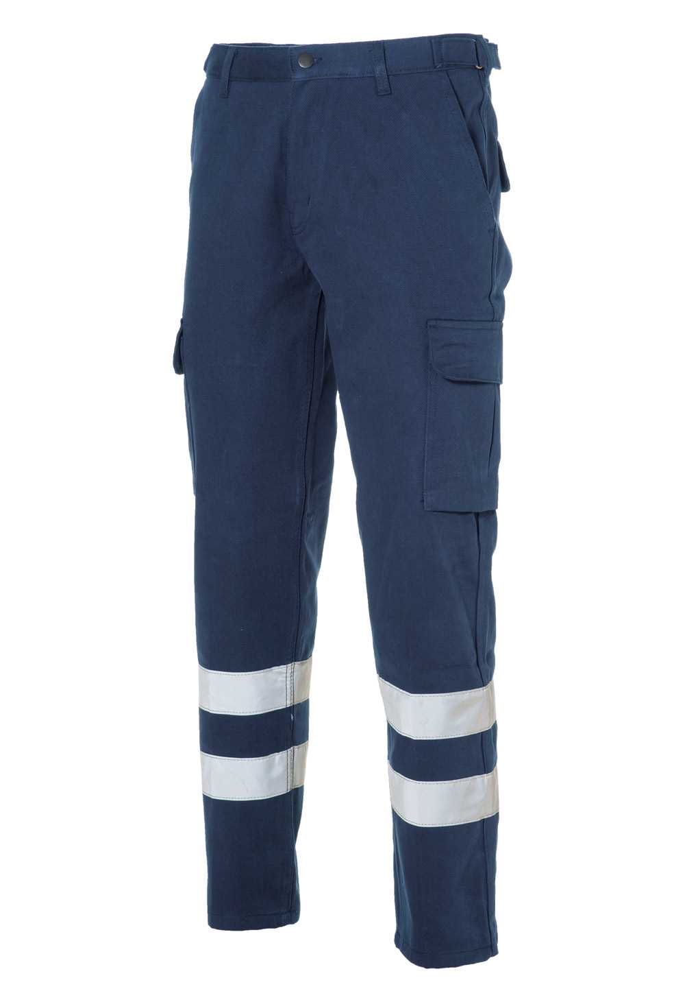 DESCRIZIONE: Pantalone con due tasche laterali a filetto, due dietro e due tasconi sul gambale chiuse con patta e velcro. Apertura frontale con zip e bottone di chiusura. Regolatore di taglia in vita. Doppie cuciture nei punti di maggior sforzo. Con doppia banda rifrangente.