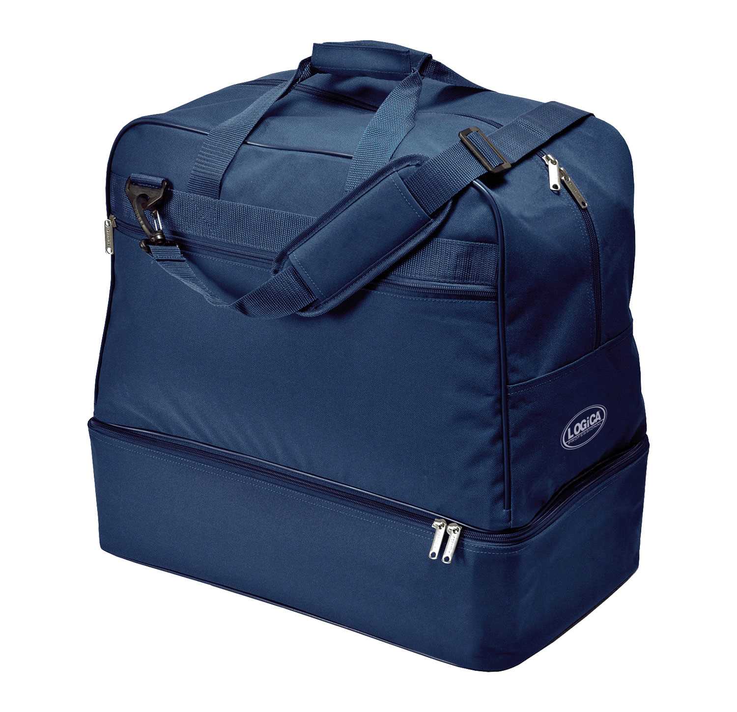 DESCRIZIONE: Borsone con manici e tracolla, un tascone laterale, vano portascarpe con supporto rigido (H 13 cm), porta cartellino cucito sul laterale, chiusure con zip.