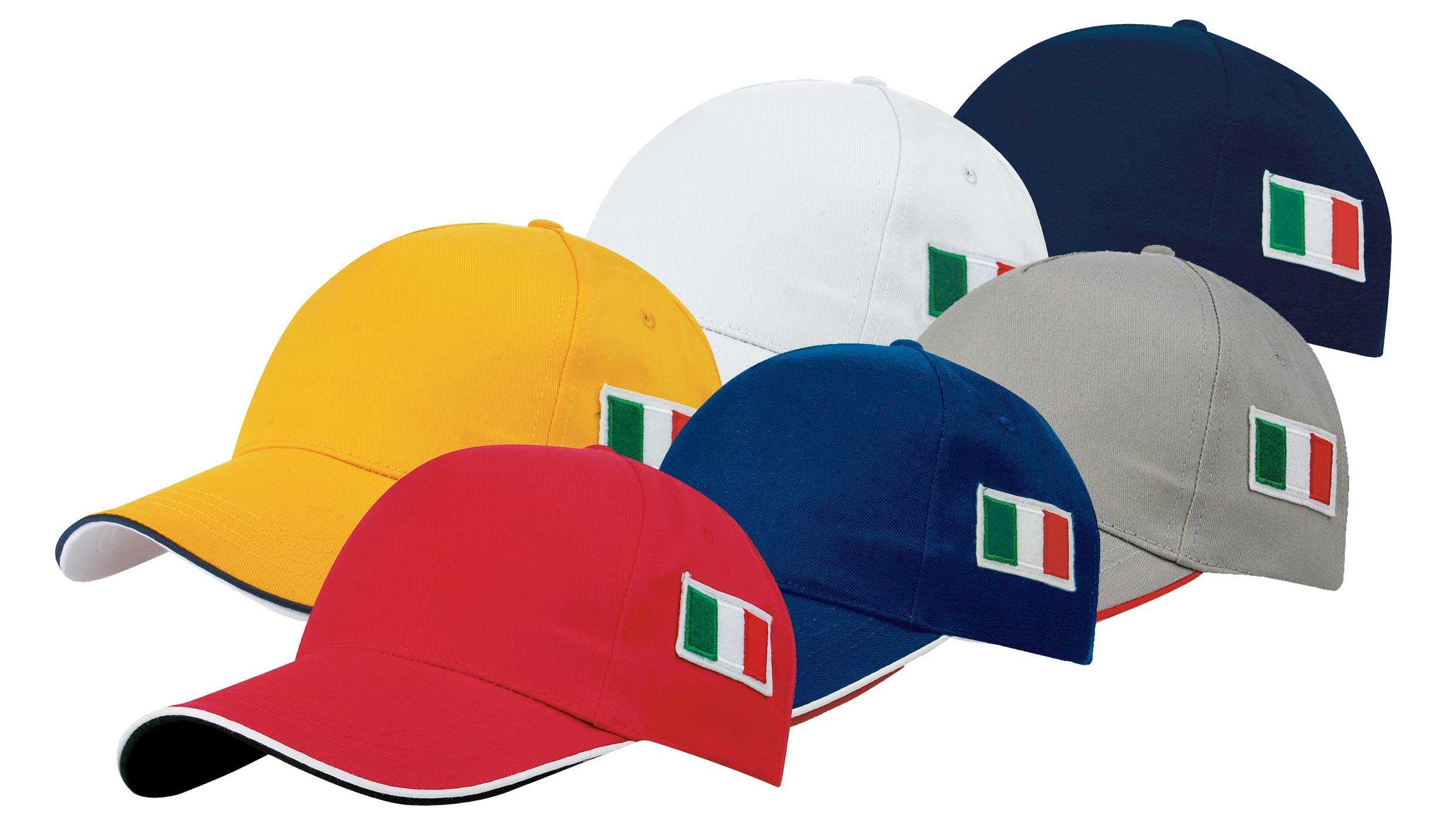 DESCRIZIONE: Cappellino a 5 pannelli, con bandierina Italiana a lato. Visiera rigida precurvata, con pipping e sottovisiera a contrasto, chiusura regolabile con velcro.