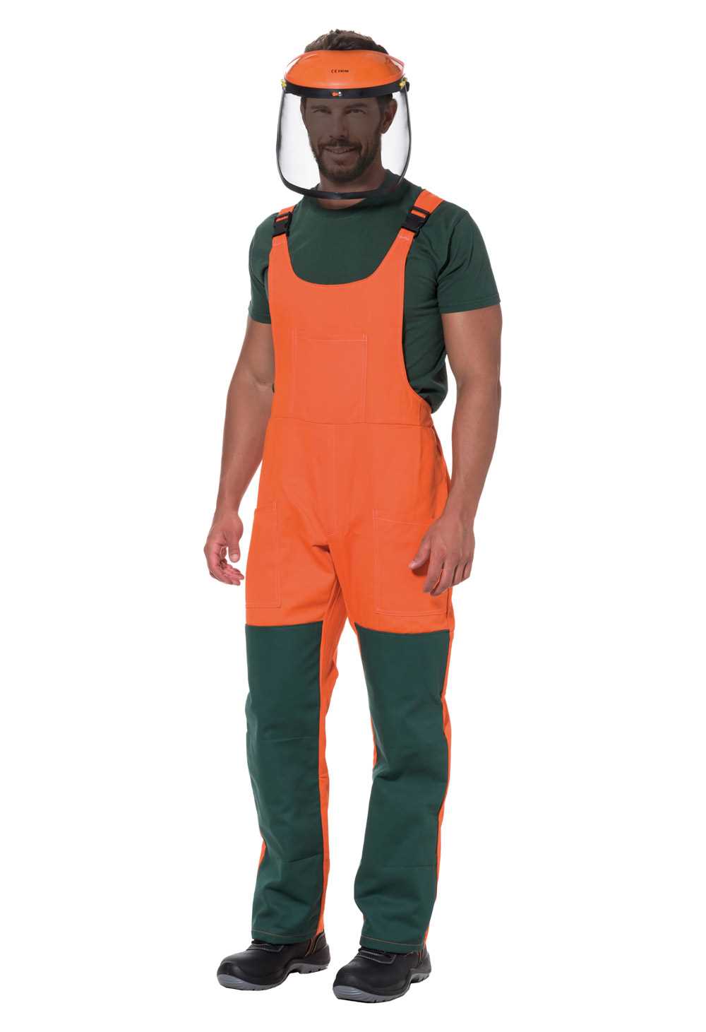 DESCRIZIONE: Salopette arancione con due tasche a filetto ed una al petto. Bretelle regolabili con fibbie di plastica. Doppio stato sul gambale in colore verde per una buona protezione da schegge e schizzi di materiale.
