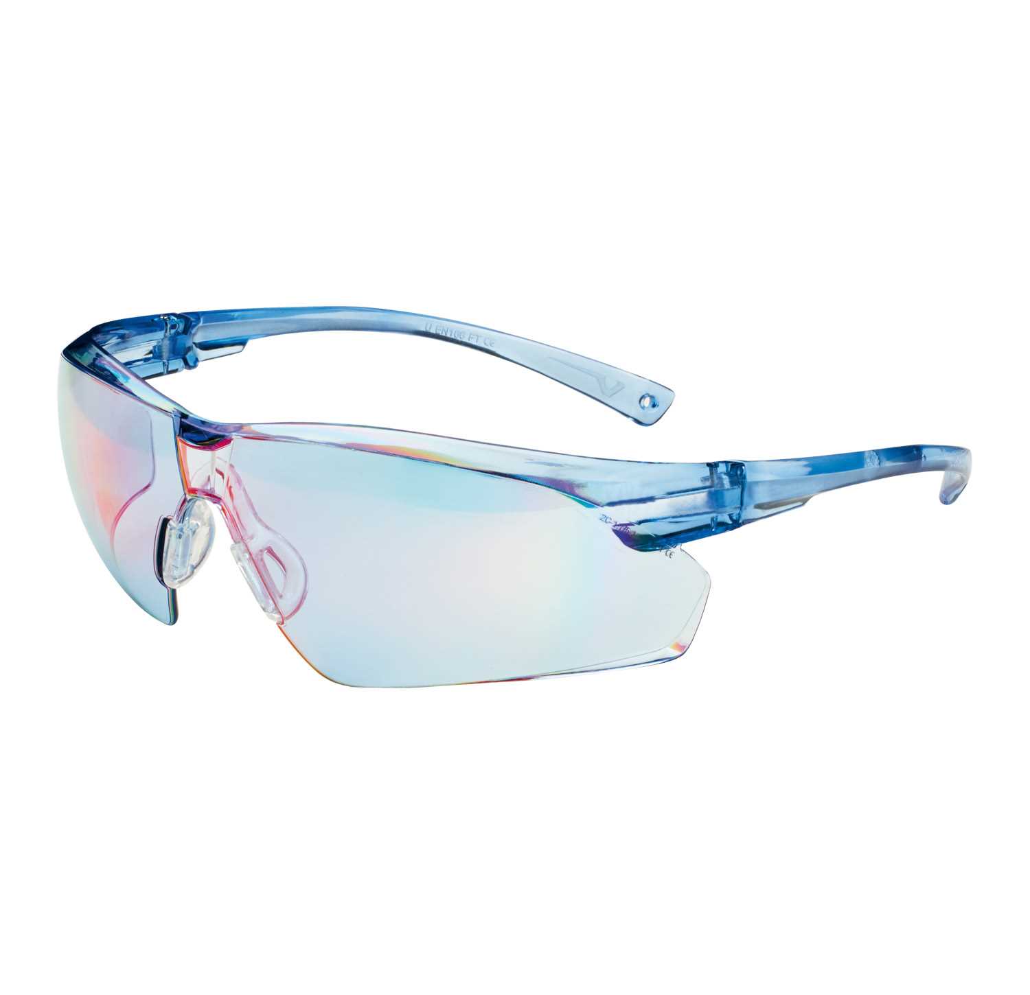 DESCRIZIONE: Occhiale ultraleggero ed avvolgente con lente in policarbonato specchiata celeste. Antigraffio con trattamento antiappannante. Riduce l’affaticamento oculare in ambienti con luce gialla. Protezione UV 400Nm. Struttura elastica e molto flessibile. Aste ergonomiche. Nasello regolabile. Cordino incluso nella confezione