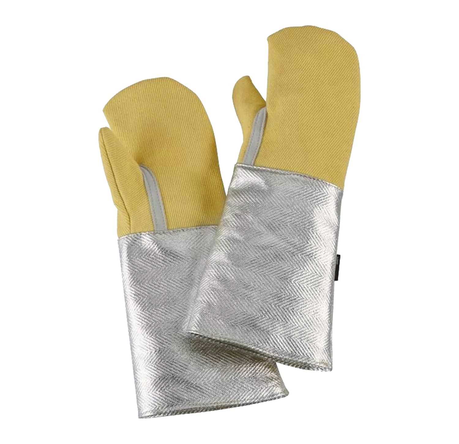 DESCRIZIONE: Guanto a 2 dita tutto in tessuto di fibra aramidica 480 g/mq accoppiato a maglina cotone 220g/mq, con palmo rinforzato in tessuto Termoglas 410g/mq, accoppiato a maglina cotone 220g/mq. Manichetta in tessuto aramidico alluminizzato 450g/mq. Cuciture tutte in filato di kevlar 50/3.
