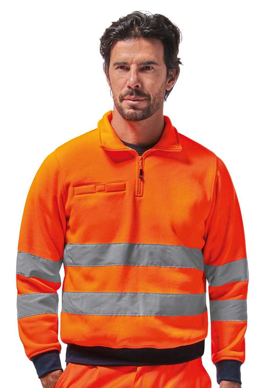 DESCRIZIONE: Felpa alta visibilità con zip corta. Polsini e fondo vita elasticizzati blu. Doppia banda rifrangente H 5 cm. Taschino nel petto a destra chiuso con velcro. Portanome a scomparsa.